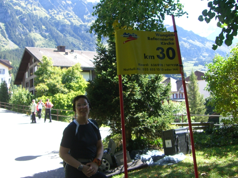 Lauterbrunn. Soweit hätte ich gar nicht kommen dürfen. Aber ich war da. Noch im Rennen. Nun denn. Dann also hin zum Halbmarthon. 2:35 für den Halben. Gar nicht so schlecht, wenn man bedenkt was für ein Körperschrott hier am Laufen war. Da der Besenwagen noch hinter mir war ging es also weiter. Es sollten ja ein paar tendenziell abwärts gerichtete Meter kommen bevor es nach der Überquerung des Baches flach wurde. Das half ein wenig. Allerdings war jetzt wieder Wadenkrampfvermeidungseiern angesagt.